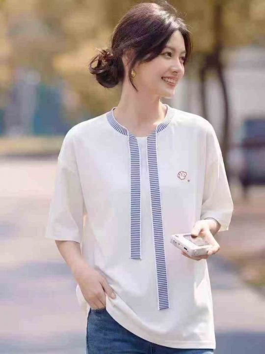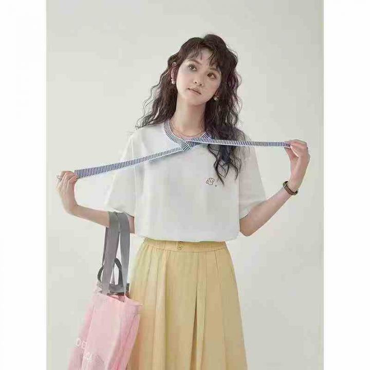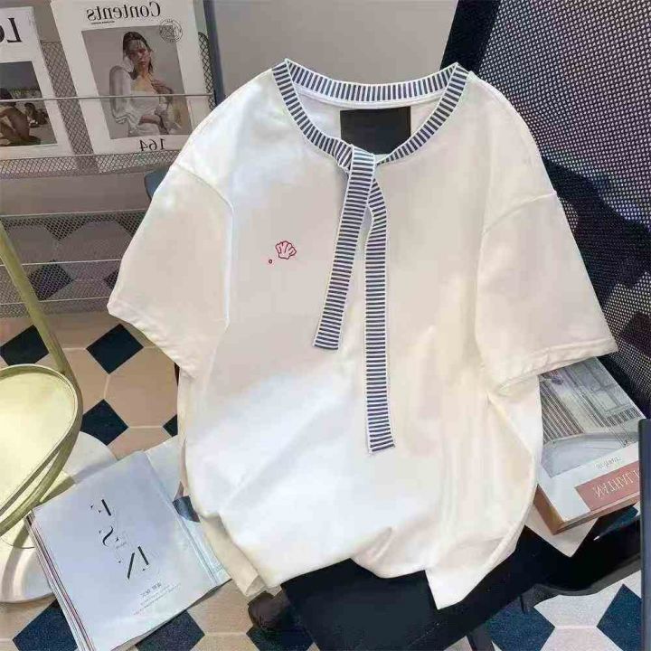 法式拼色飘带夏季设计感刺绣减龄女士纯棉短袖 数量180件左右 尺码S--L 独立包装 大货干净整洁