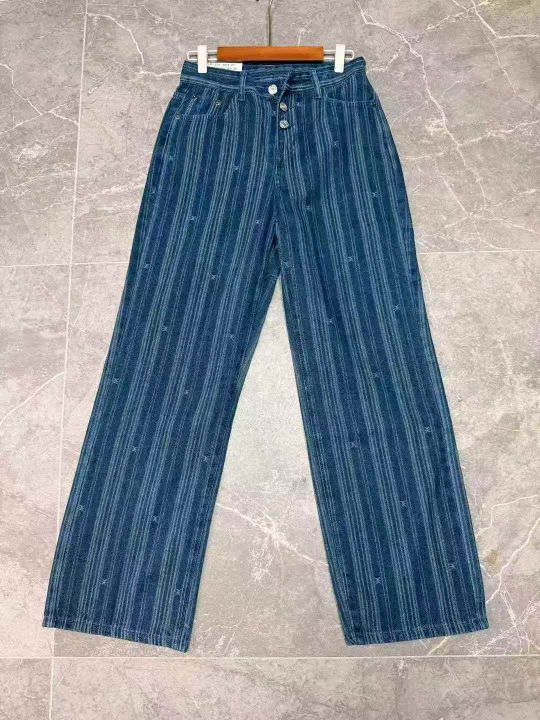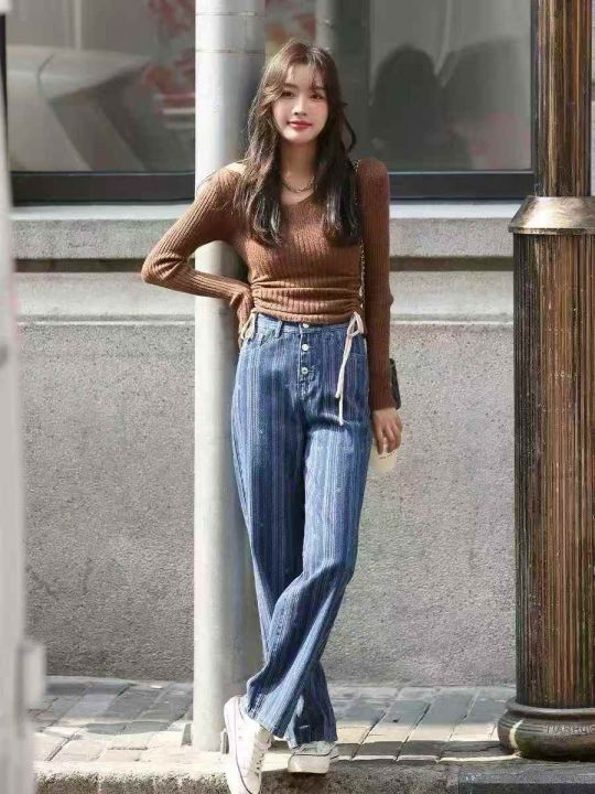 欧美风ins条纹牛仔裤女高腰显瘦阔腿设计感宽松直筒拖地裤,独立包装,S -xL码,190件左右。全清12.8块