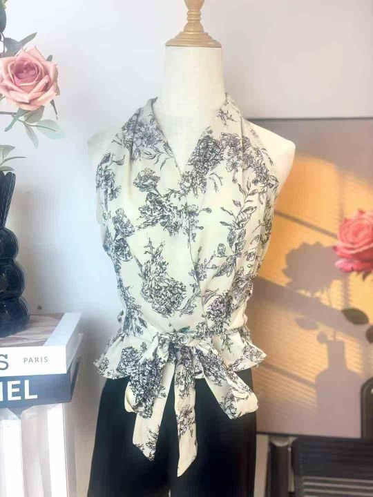 87件法式系带雪纺印花无袖挂脖背心上衣女夏轻熟法式小众高级感短款小衫,尺码S-L,独立包装!福利秒杀价7.8 不分货