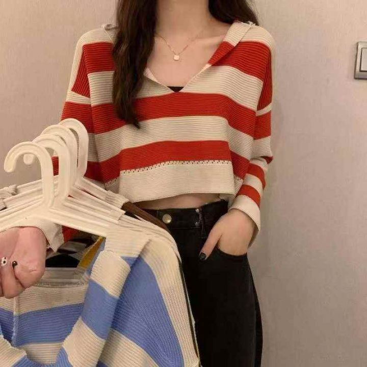 春季新款撞色条纹短款宽松慵懒风连帽针织套头毛衣,独立包装,均码面料柔软...