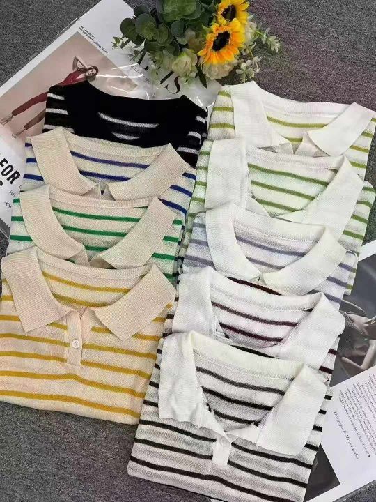 早秋新款韩系宽松高级感撞色条纹百搭POLO领长袖针织毛...