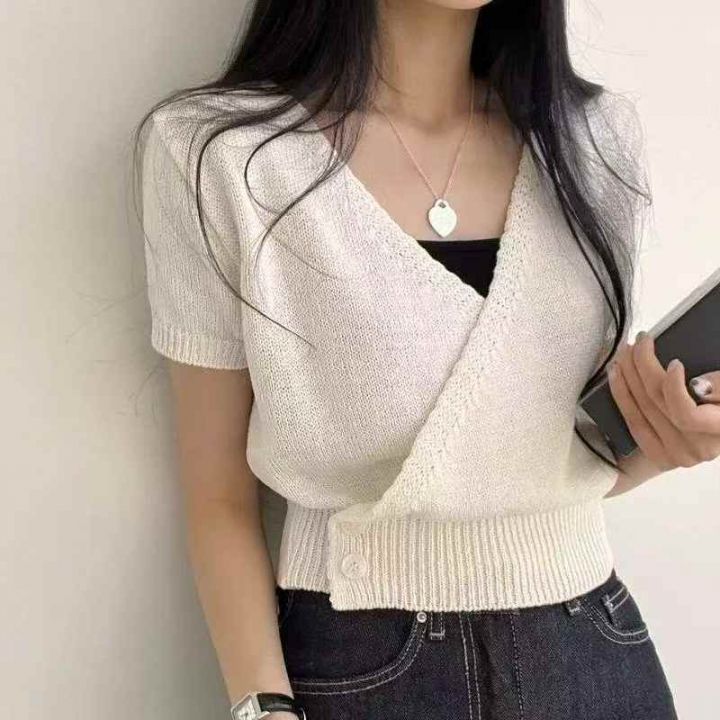 夏季新款法式小众设计感斜襟V领气质两粒扣收腰针织短袖T桖,独立包装,均码面料柔软舒适有弹力,538件,全清4.9元超低价秒杀!分货加一!