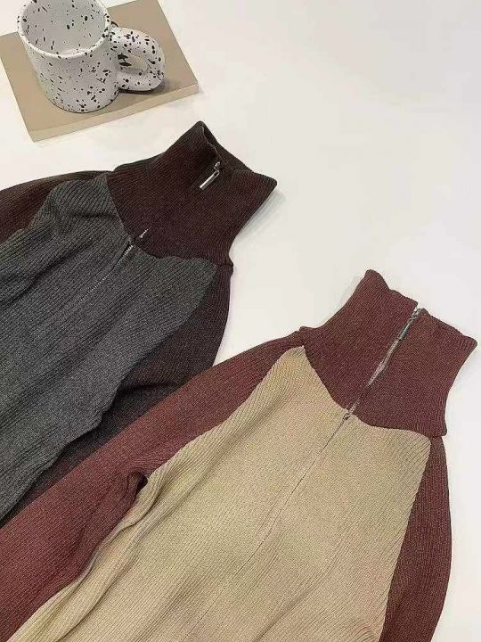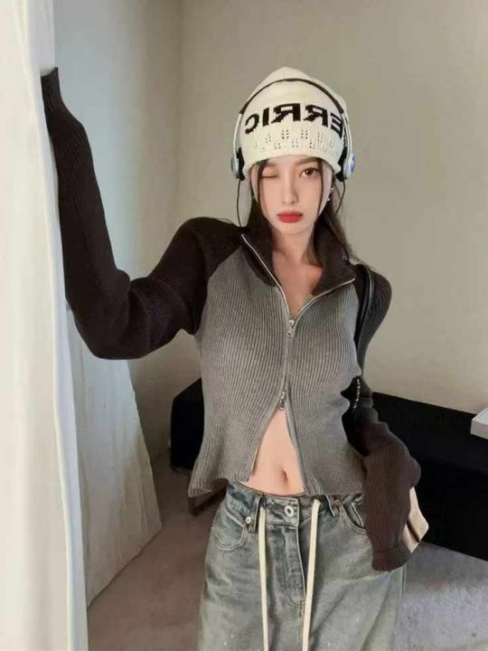 春季新款撞色插肩双头拉链辣妹设计感弹力修身针织毛衣...
