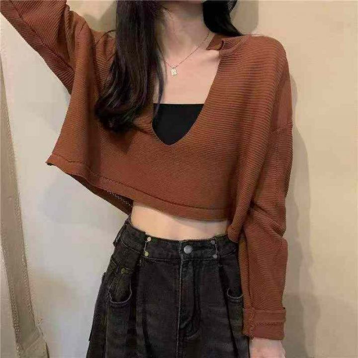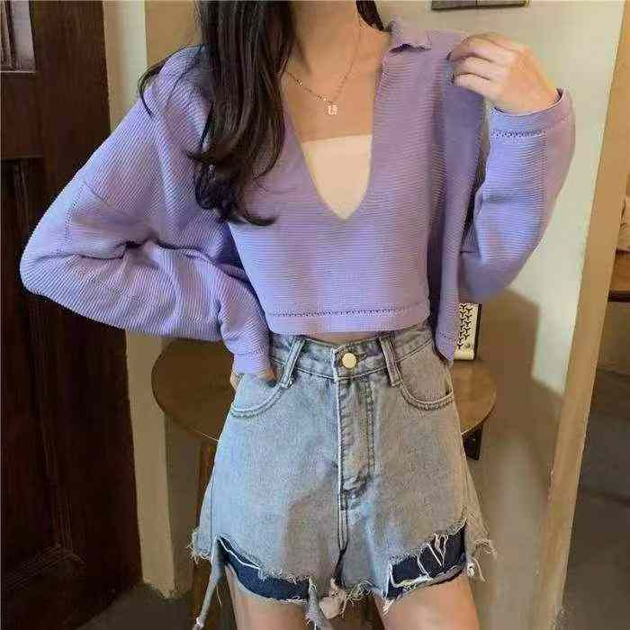 春秋新款韩系温柔风短款宽松长袖针织衫,独立包装,均...