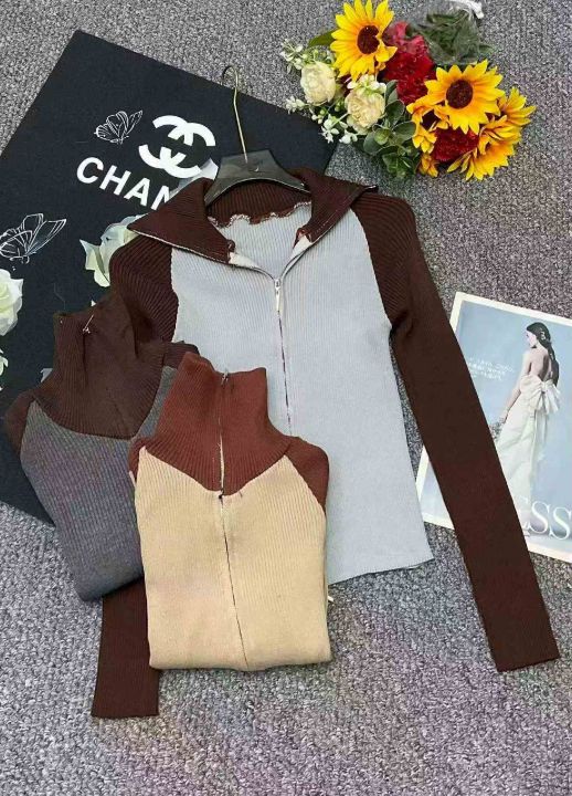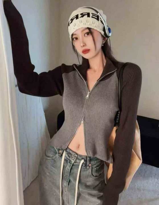 春季新款撞色插肩双头拉链辣妹设计感弹力修身针织毛衣...