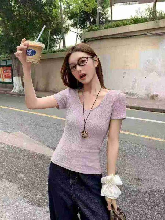 [月亮]:6.5清1240件[月亮]:韩系褶皱肌理感V领正肩T...