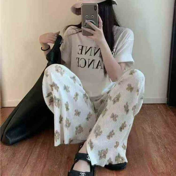 小熊印花风格百褶裤女宽松百搭垂感阔腿裤高腰直筒裤休...