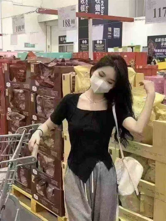 冰丝螺纹纯欲方领短袖t恤女2025夏季修身chic别致独特甜辣妹正肩短款上衣,1到6码,独立包装,货品干净,1000件左右,5.8清,分货加1