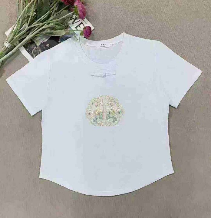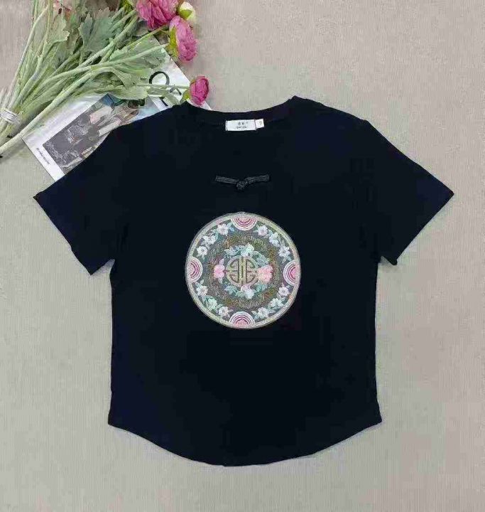 1625件国风重工刺绣中式盘扣拉架棉短袖T恤女,以黑色...