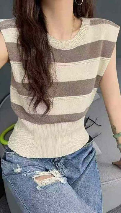 夏季新款小众别致撞色条纹冰丝无袖针织背心,独立包装...