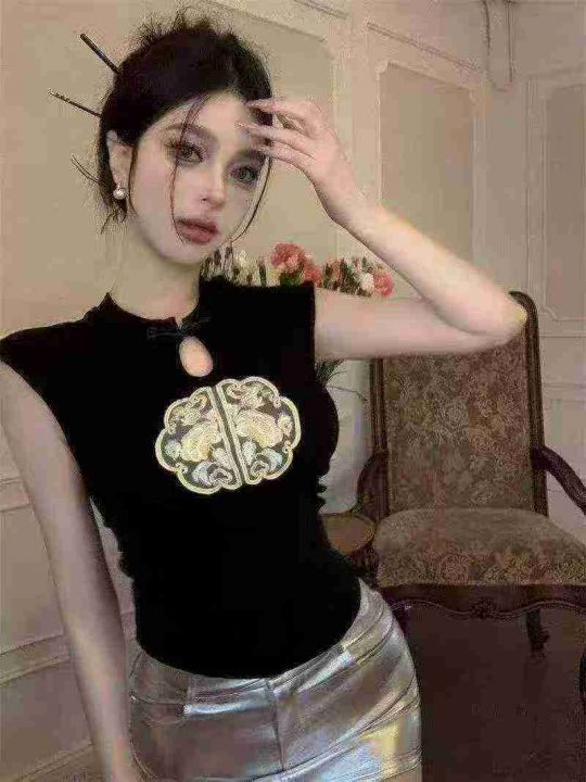 夏季新款复古新中式盘扣国风刺绣设计感百搭针织小衫,...