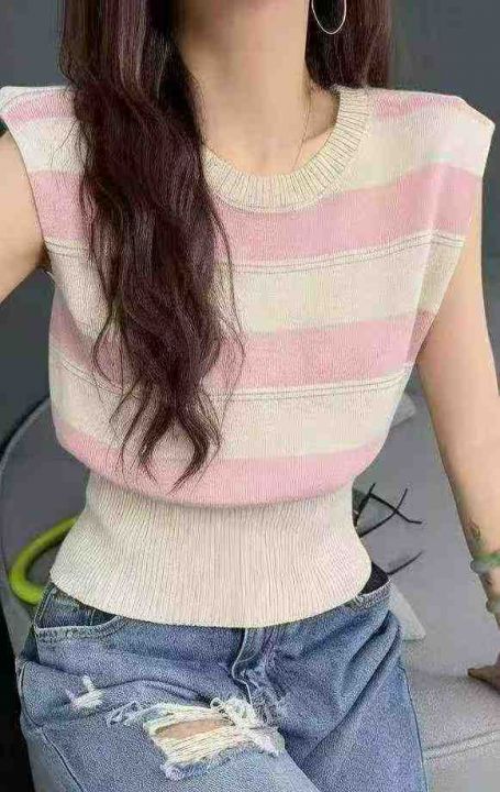 夏季新款小众别致撞色条纹冰丝无袖针织背心,独立包装...