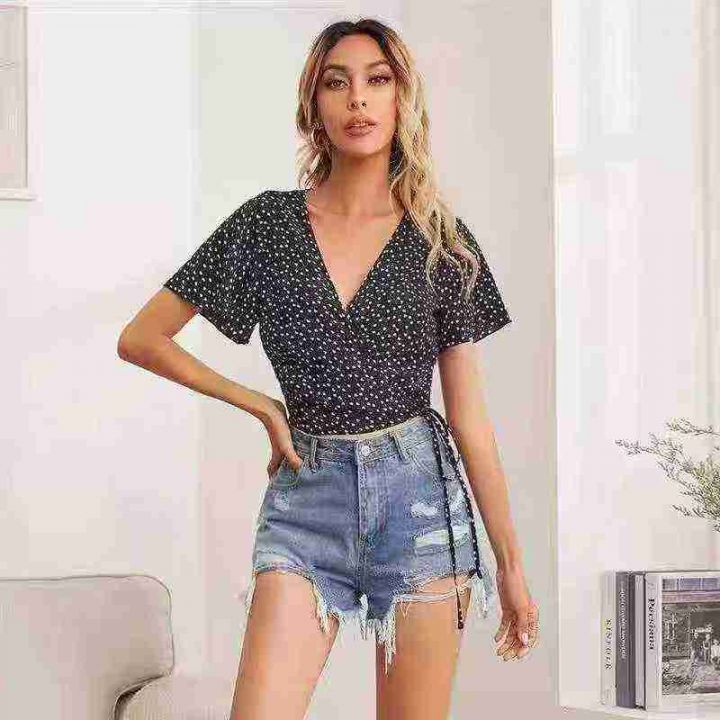 [月亮]:5.5清443件[月亮]:欧美辣妹深V绑带碎花上衣[...