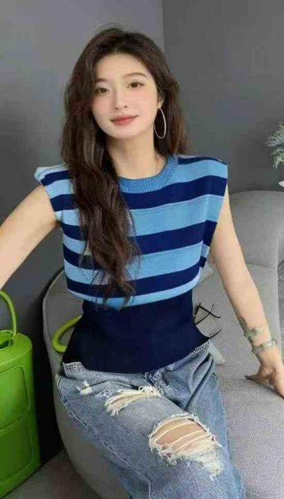 夏季新款小众别致撞色条纹冰丝无袖针织背心,独立包装,均码面料柔软舒适弹...
