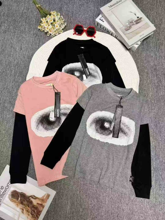 童装圆领假两件纯棉长袖上衣,整款三色,高弹力,领口...