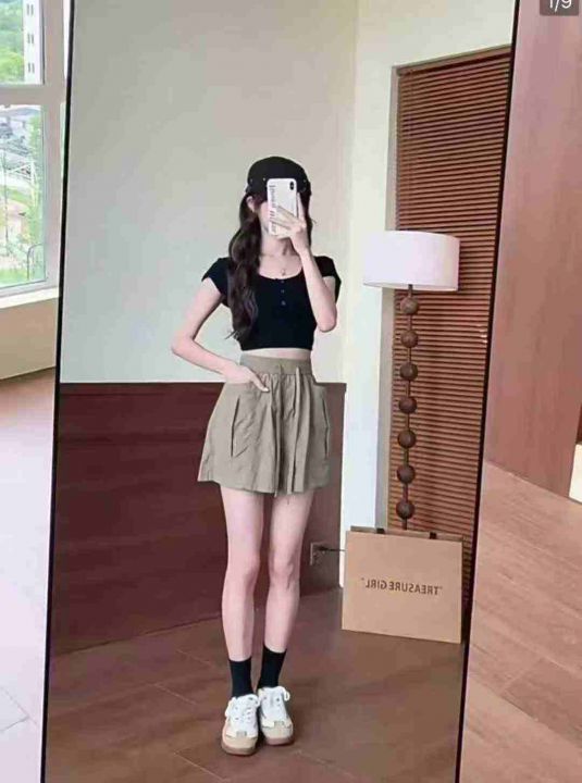 夏季大码女装高腰百搭阔腿裤复古工装口袋短裤