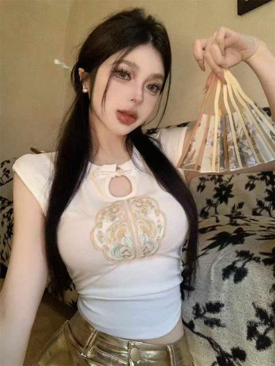夏季新款复古新中式盘扣国风刺绣设计感百搭针织小衫,...