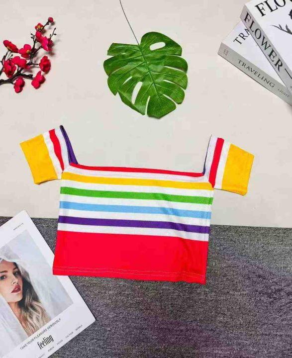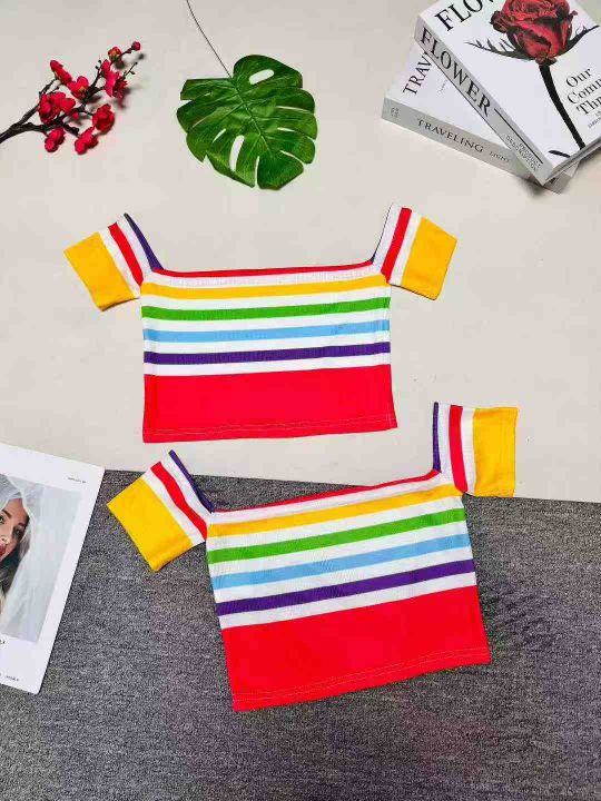 1.8清:夏季新款修身显瘦辣妹一字领条纹短款针织上衣...