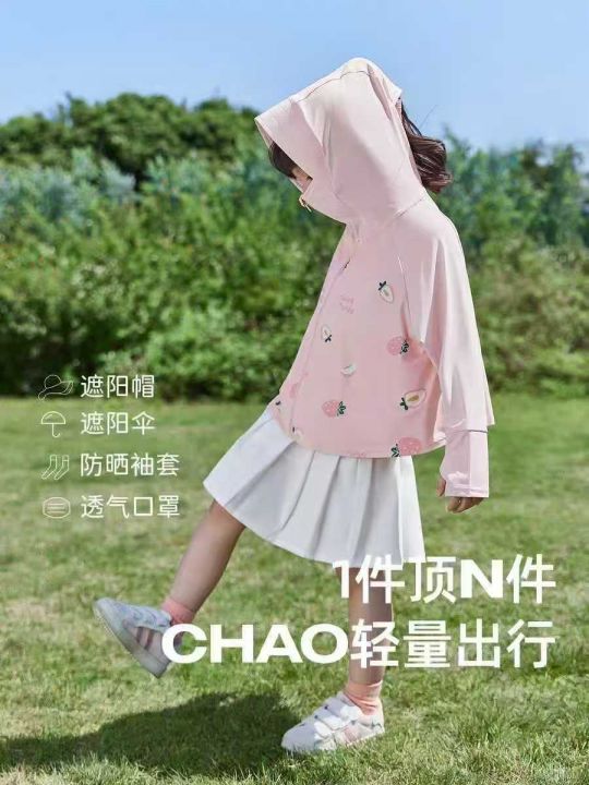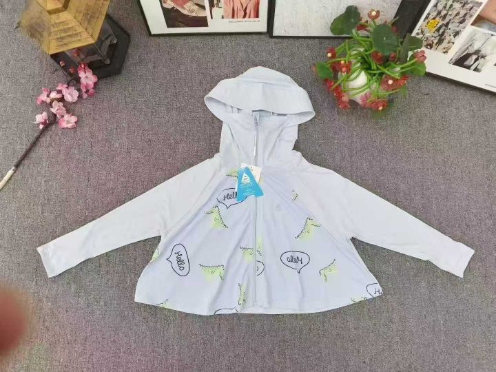 统一品牌童装印花防晒衣,数量2500件左右,尺码110--160,两个色,后领包边,锦纶氨纶面料,独立包装带吊牌,大货干净整洁质佳!模特图供参考