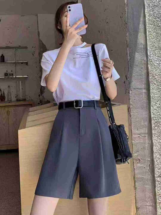 [月亮]:夏季休闲半松紧腰纽扣垂感五分西裤