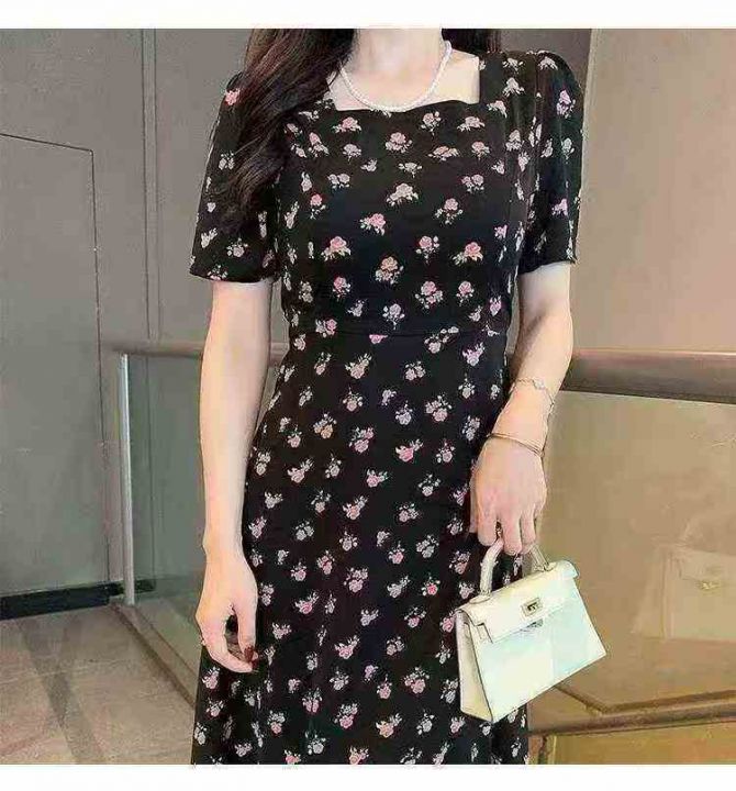 碎花裙女夏季新款女长款修身显瘦方领短袖小黑裙子法式...