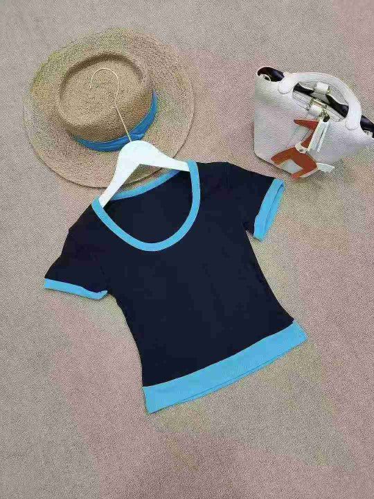 [月亮]:辣妹U领垂感拼色设计假两件T恤