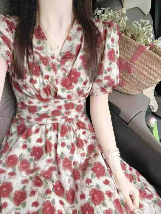 ☕️法式碎花连衣裙夏季新款高级感收腰显瘦v领雪纺连...