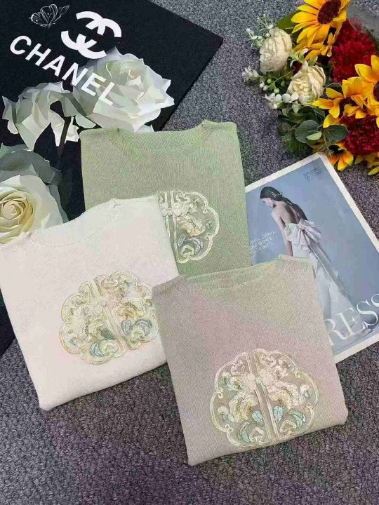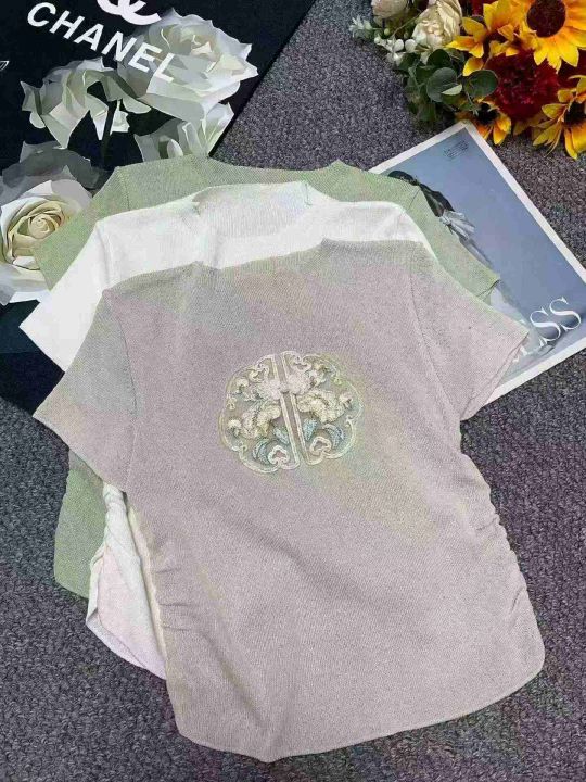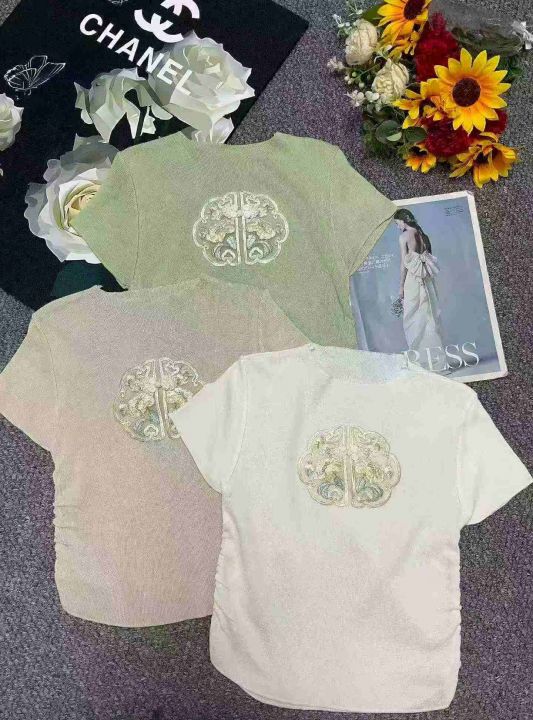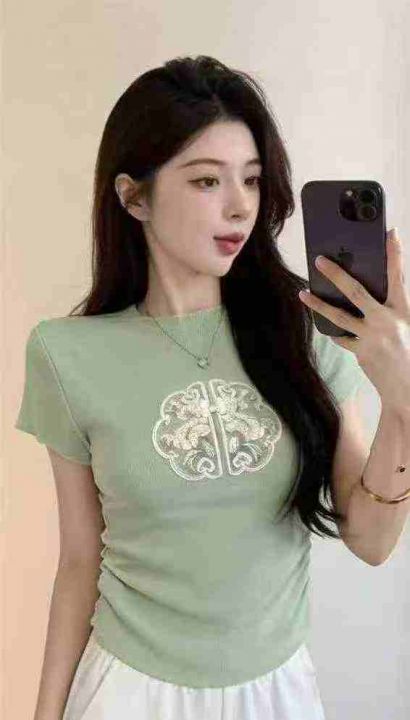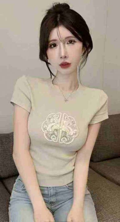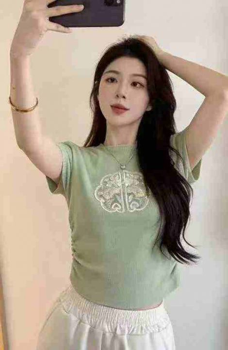夏季新款纯欲甜辣妹弹力修身显瘦致绝美半袖新中式国风刺绣针织短袖t恤,独立包装,均码面料柔软舒适弹力大,465件,全清4.9元超低价秒杀!分货加一!