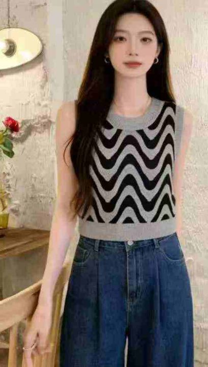 夏季新款韩系小香风波纹撞色圆领无袖针织毛衣马甲,独...