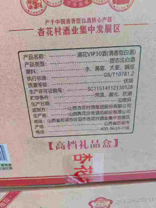 新到100箱清花VIP--30礼盒酒,全清私聊,10箱起发190元,一箱起发200元一箱,一箱3提,一提2瓶,带手提袋,2026年生产,53度清香型白酒,山西杏花村集团出品!。 货号:29195