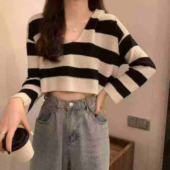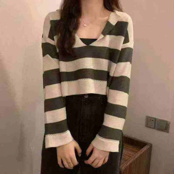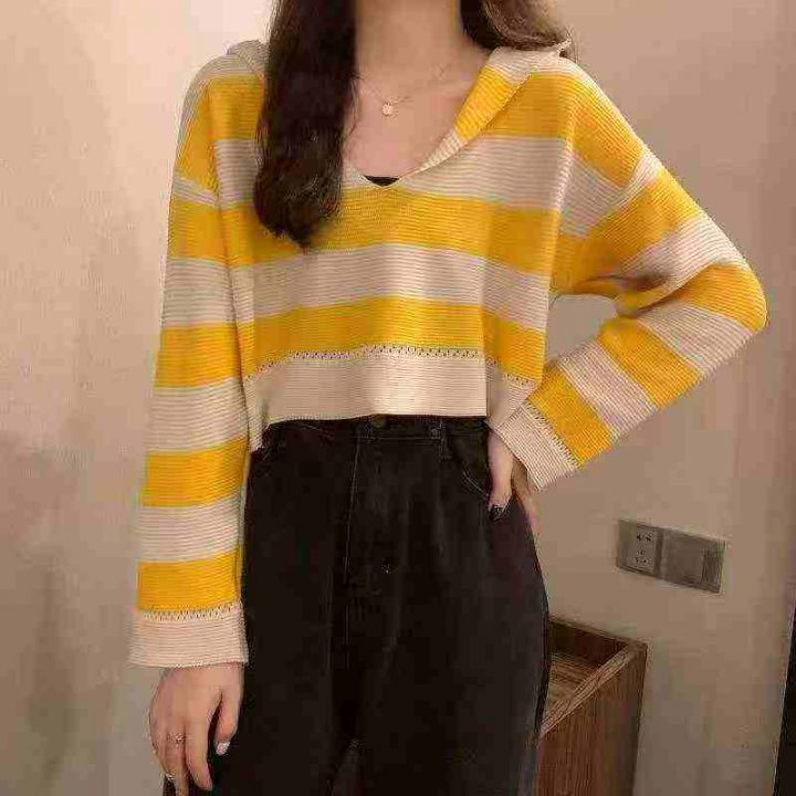 春季新款撞色条纹短款宽松慵懒风连帽针织套头毛衣,独...
