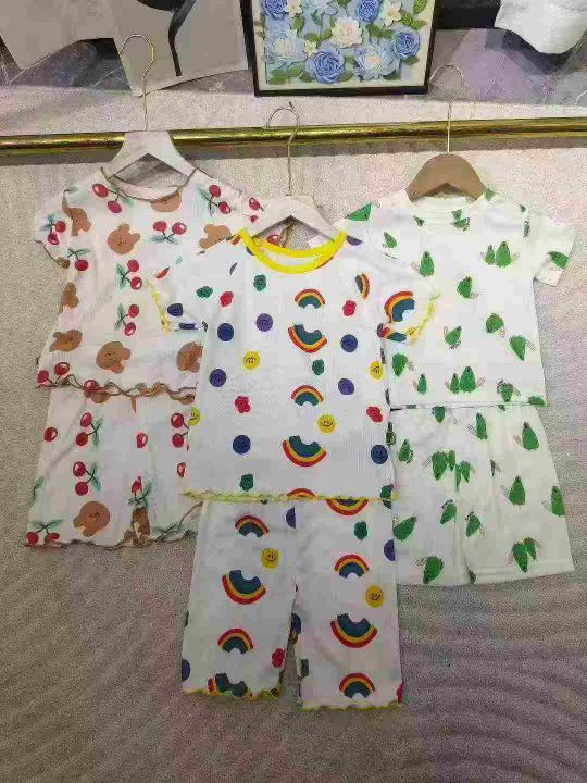 儿童冰丝透气家居服睡衣套装 数量19000套 尺码90--150 有短裤短袖套装 有长裤短袖套装 有长袖长裤套装 颜色很多logo很多 独立包装带吊牌 大货干净整洁