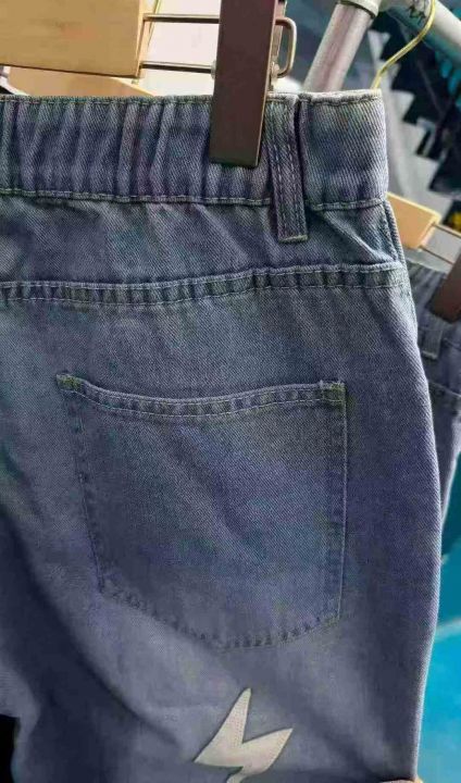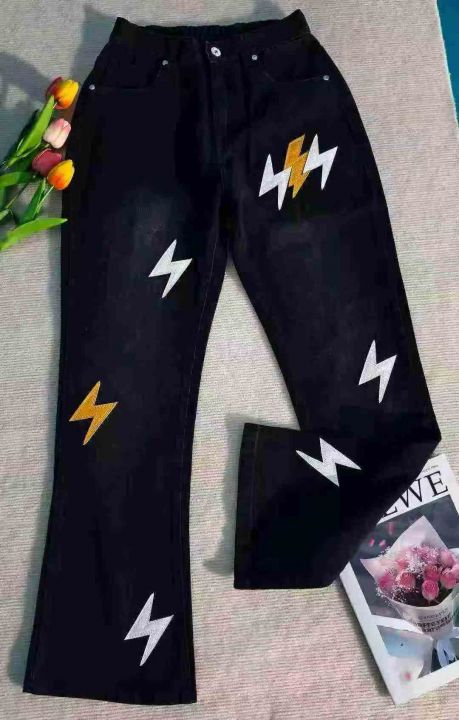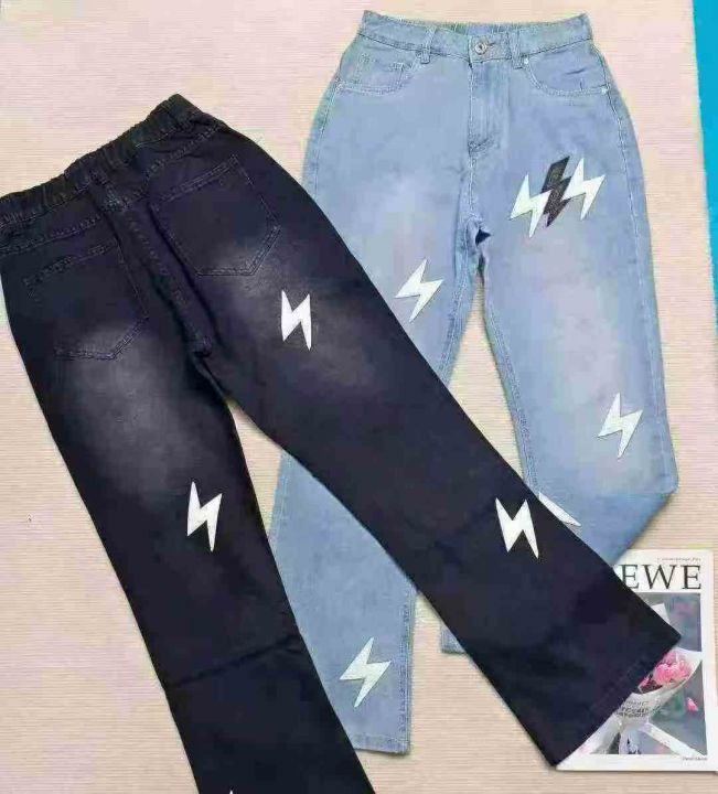 水洗棉直简微喇叭长裤松紧腰美式潮牌宽松闪电皮刺绣牛仔裤,488件,S-2XL,男女同款,独立包装,全清13.8元,分货+0.5