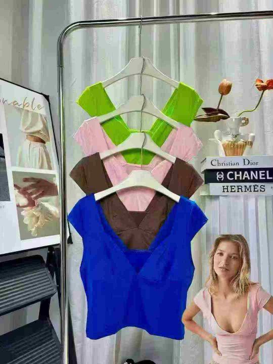 夏季新款法式小众设计感斜襟V领气质两粒扣收腰针织短袖T桖,独立包装,均码...