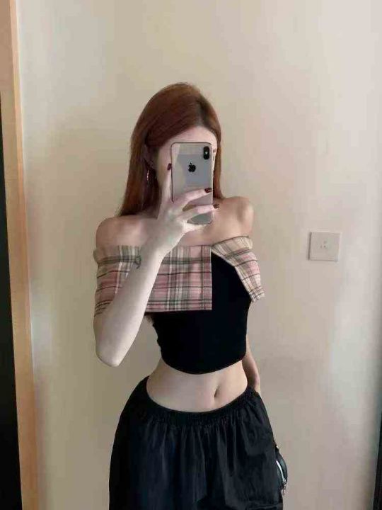 复古格纹一字肩短袖64件7.5,面料舒适透气,有弹力,格纹拼接设计,码数1-3...