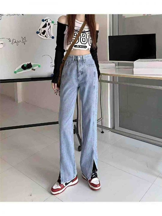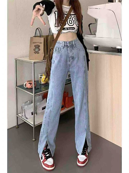 春秋新款网红复古设计款前开叉直筒阔腿牛仔裤,独立包...