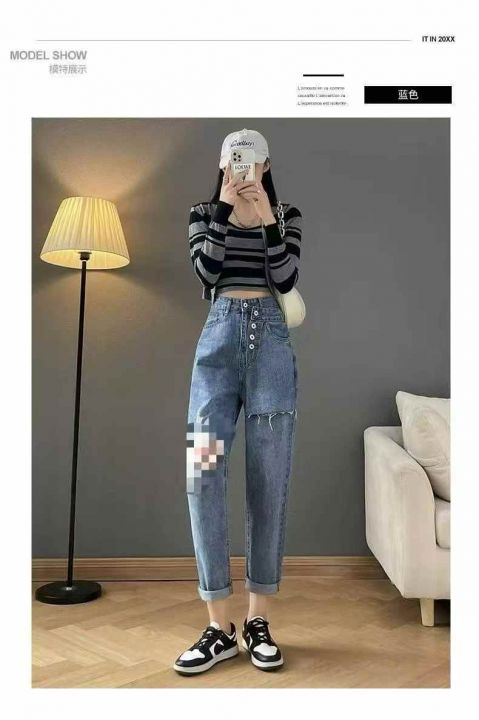 欧货排扣拼接牛仔裤女新款高腰宽松显瘦百搭哈伦老爹裤潮55条全清11.8元,码...