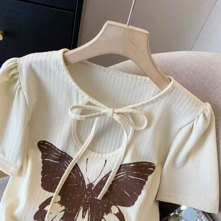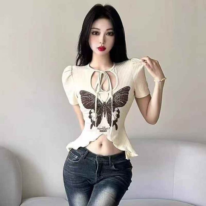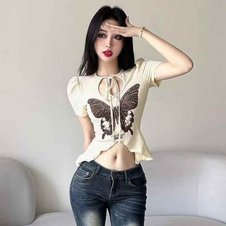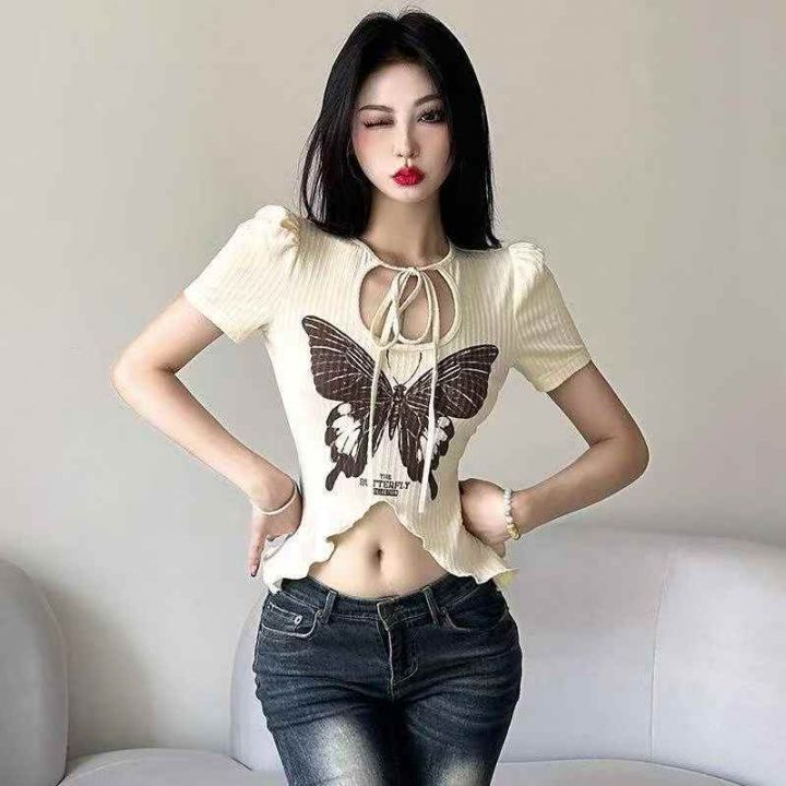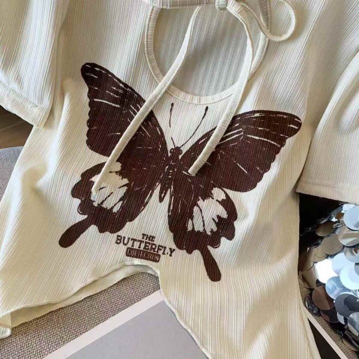 夏季新款纯欲甜辣风复古蝴蝶水印系带不规则设计款小衫...