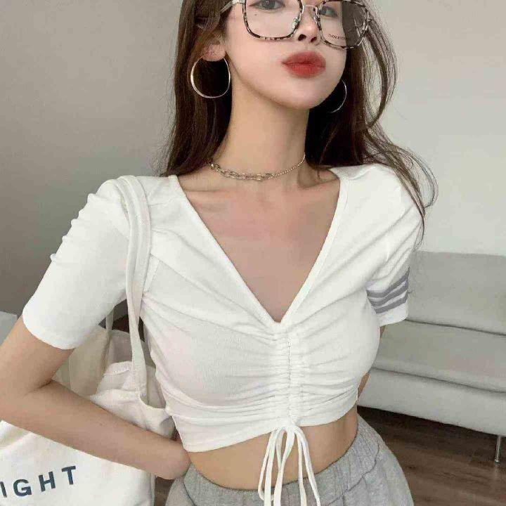 夏季新款纯欲风v领设计感抽绳小心机针织短袖小衫,独...