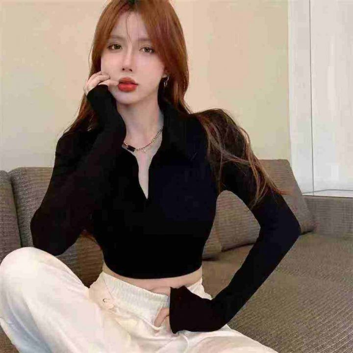 900件美式复古辣妹polo领显瘦露脐紧身长袖T恤,尺码xs...