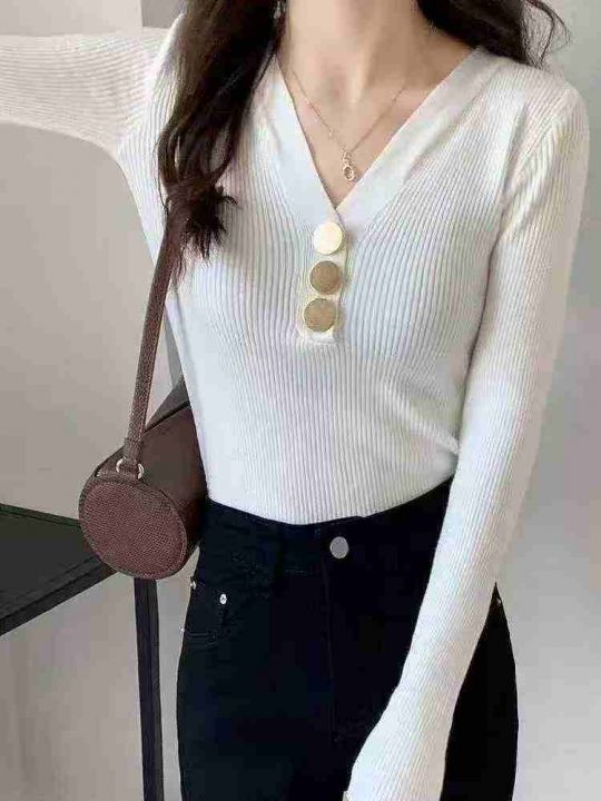 春秋新款韩版洋气纽扣V领坑条包芯纱套头毛衣,独立包...