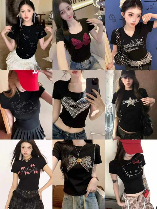 ☕️美式辣妹纯棉烫钻短袖t恤女新款修身正肩甜辣妹短款上衣2000件全清10.8...
