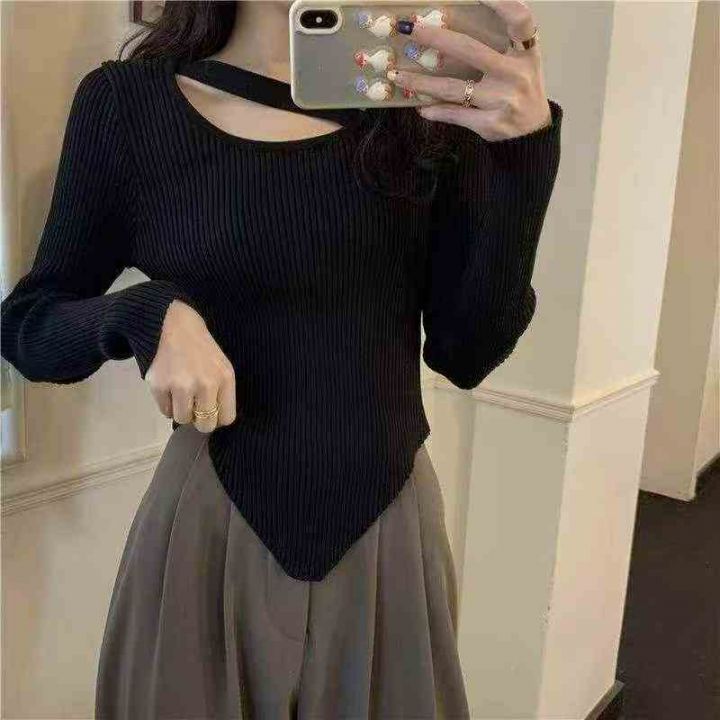 春秋新款网红设计感小众不规则洋气弹力修身显瘦坑条包芯纱套头毛衣,独立包...