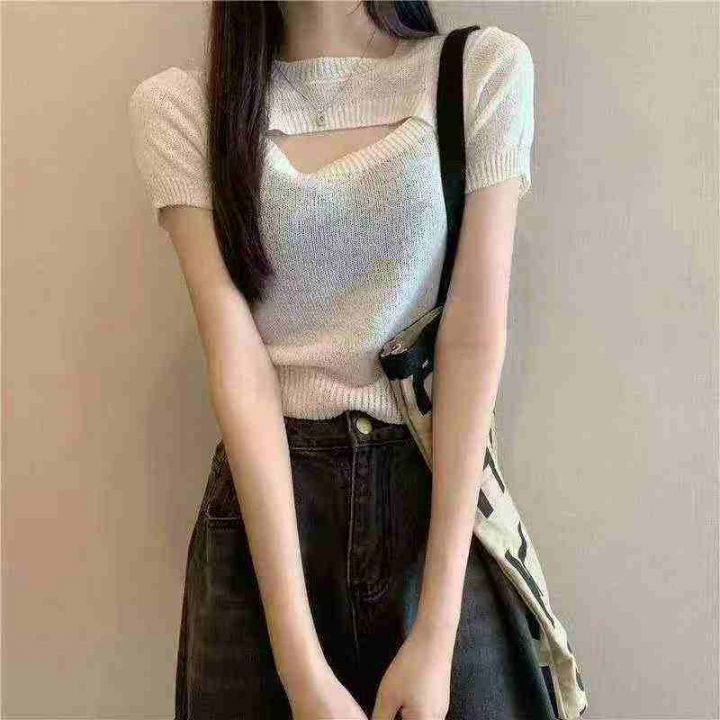 夏季新款不规则镂空正肩辣妹冰丝针织短袖小衫,独立包...