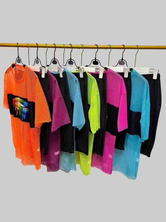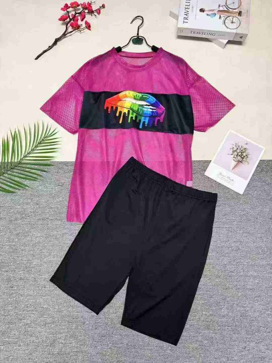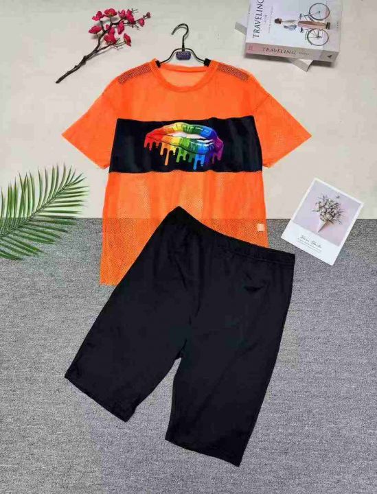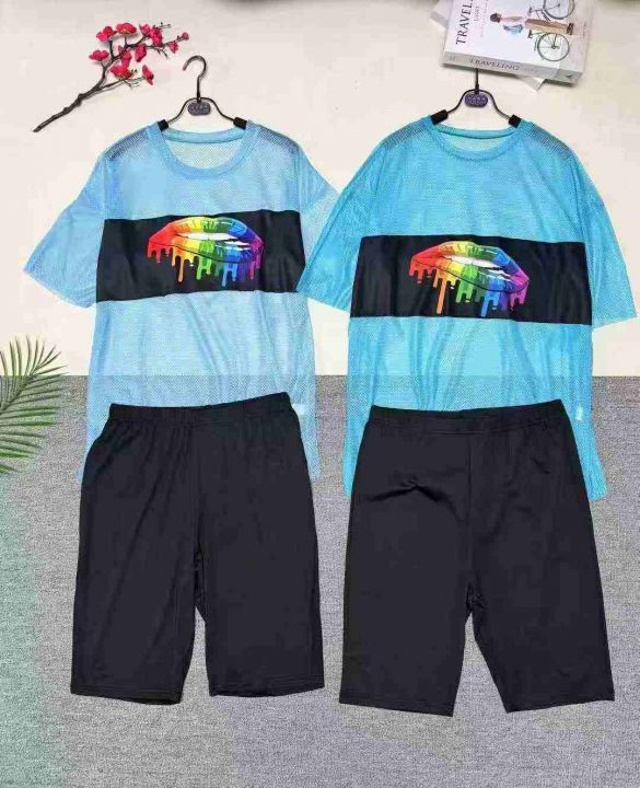 欧美时尚洋气网眼印花短袖两件套,整款多色,数量:437套,码数:S-2XL,品质好,有独立包装。
