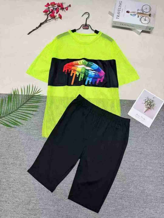 4.5清欧美时尚洋气网眼印花短袖两件套,整款多色,数...