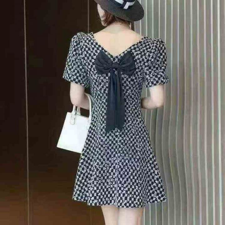 法式方领泡泡袖连衣裙96件8.5,后蝴蝶结设计,侧腰拉...