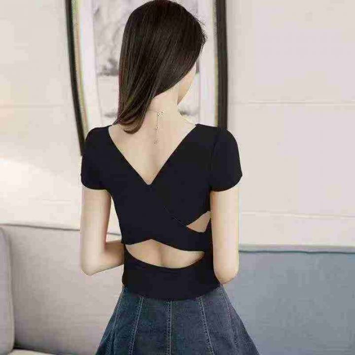 夏季新款韩版chic小心机露背弹力修身显瘦短袖针织小衫...