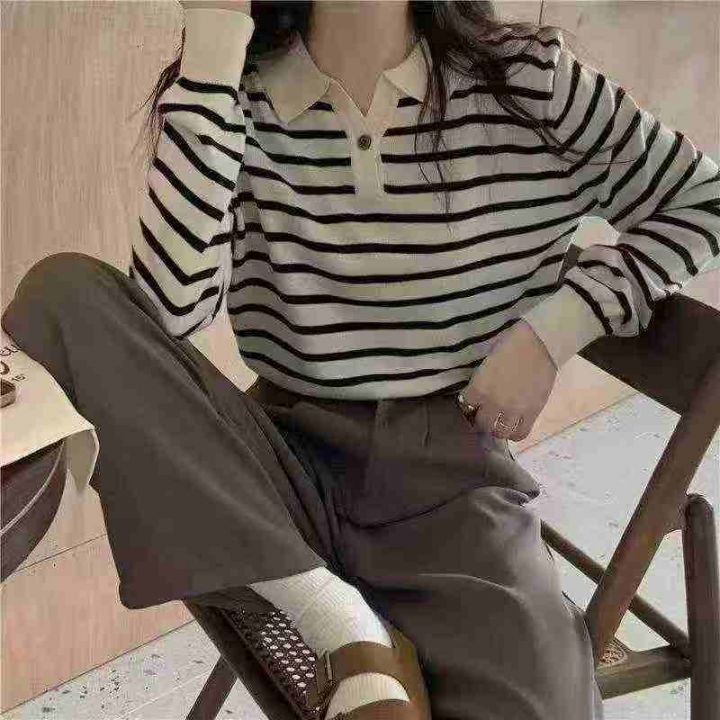 早秋新款韩系宽松高级感撞色条纹百搭POLO领长袖针织毛...