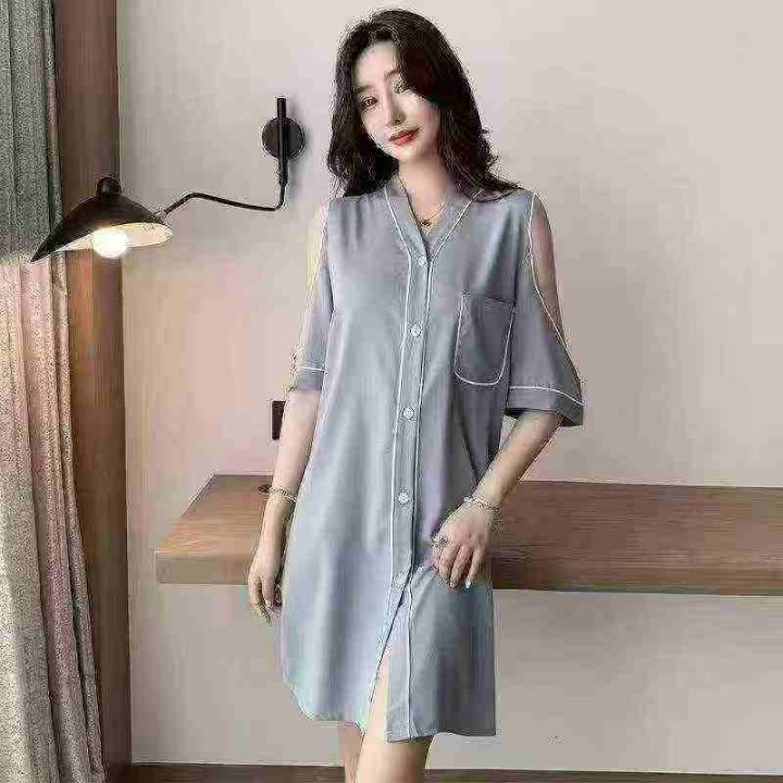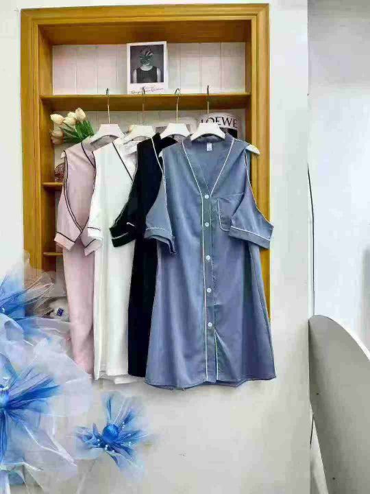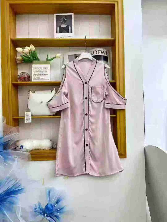 ① 网红冰丝性感露肩韩版宽松家居睡裙!独立包装,整款五色,有部分长袖款...